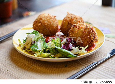 Vegetarian arancini on the wooden cafe table
