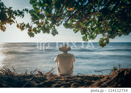 ハワイ、ノースショアのハレイワ アリイ ビーチで海に沈む夕陽を眺める若者