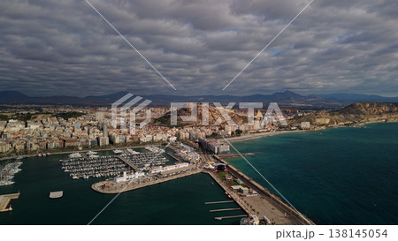 Aerial panoramic view of Alicante marina, Santa Barbara castle and Mediterranean coastline in Spain