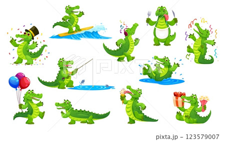 Cartoon green crocodile reptile characters set. Cheerful alligators surfing, fishing, eating ice cream, holding balloons, celebrating, listening music and relaxing, display fun and playful expressions