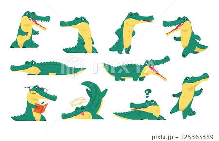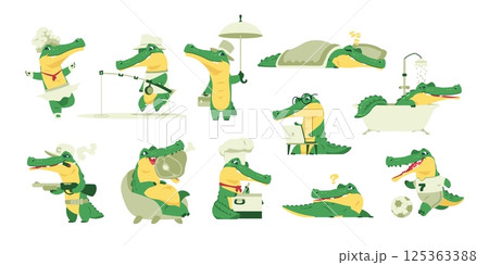 Humanized Crocodile Character Every Day Activities Set Of Illustrations