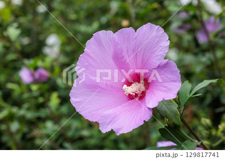 ガーデンに美しく咲くピンク色のタチアオイの花
