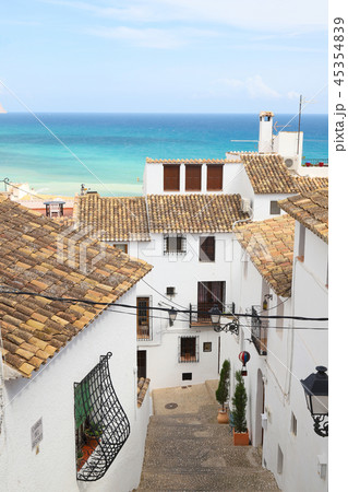 スペイン 地中海の白い町アルテアのランドマーク 教会を背景にしたメインストリート