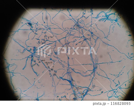 胞子と菌糸が混ざっている顕微鏡写真