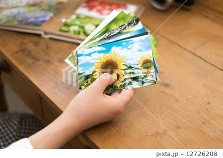テーブルの上に重ねてて置かれたたくさんの写真プリント