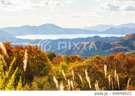 秋田仙北の秋 紅葉の田沢湖高原 ススキ