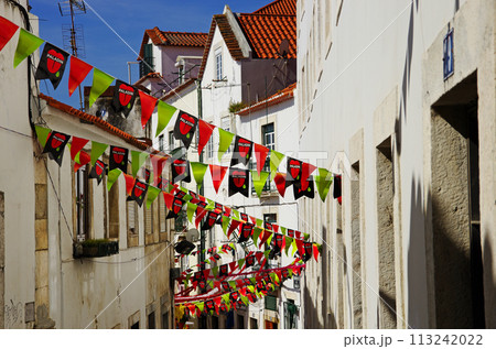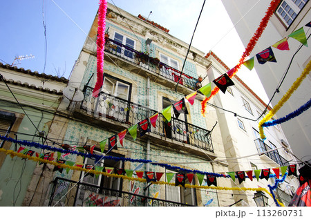リスボン旧市街の家並みのカラフルな飾りつけ
