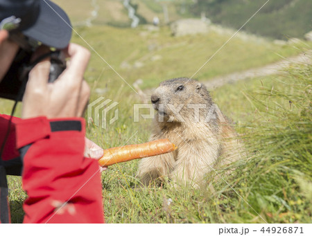 Person feeding and taking pictures of marmot