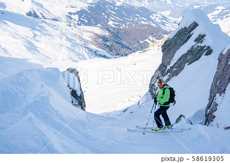 雪山をダイナミックに滑降するスキーヤー ウィンタースポーツ