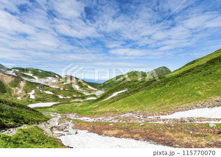 初夏の観光名所立山黒部アルペンルートの室堂の山頂付近の雪山の風景