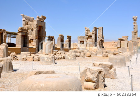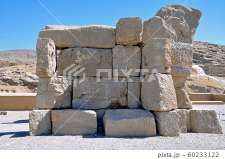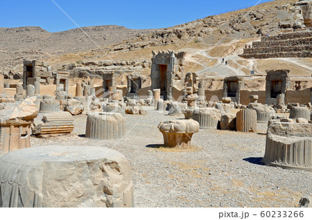 イラン ペルセポリスの百柱の間からアルタクセルクセス2世王墓を望む