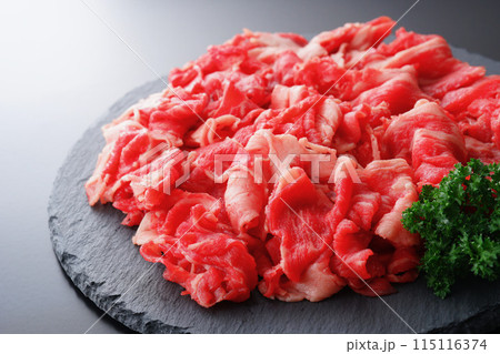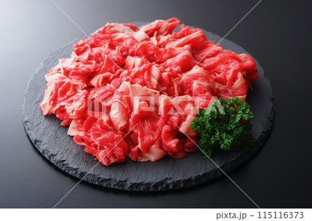 フライパンで焼くアンガス黒牛ばらカルビ焼肉 写真素材