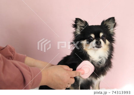 愛犬のトリミングをする飼い主の女性 ロングコートチワワ