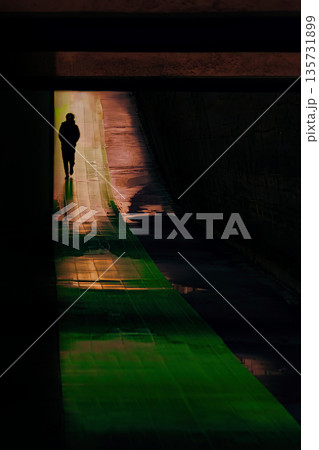 自然の光でライトアップされたアンダーパスを歩く人