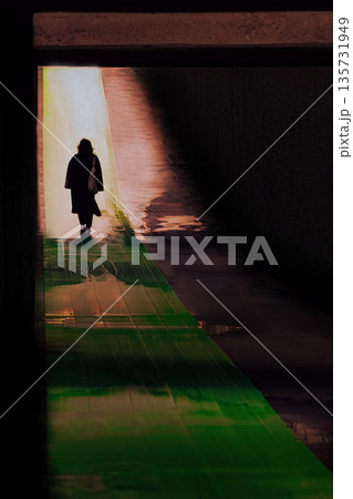 光の道をのようなアンダーパスを歩く女性