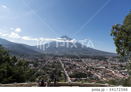 中米グアテマラサカテペケス県の世界遺産の街アンティグア カラフルな街並みとアグア山