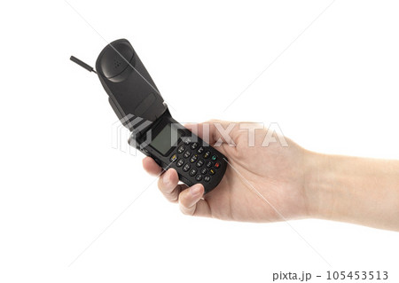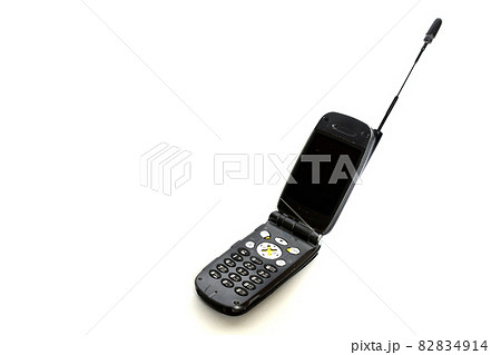 アンテナのついた、開けた状態の古い携帯電話のガラケー