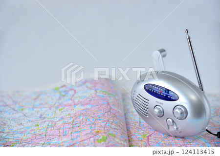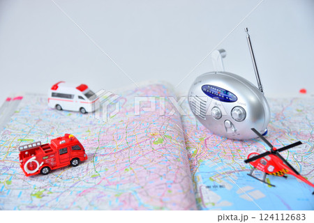 地図 ラジオ 消防自動車 災害時避難路の確認イメージ