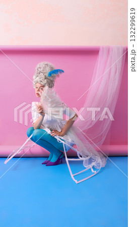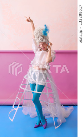Elegant woman with fan posing in theatrical costume as Marie Antoinette on pink blue background.