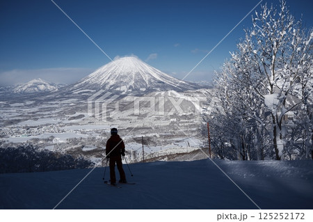 ニセコアンヌプリの山頂より羊蹄山を眺めるスキーヤー