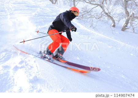 北海道虻田郡倶知安町のニセコアンヌプリのバックカントリーエリア鉱山の沢を滑るスキーヤーの転倒