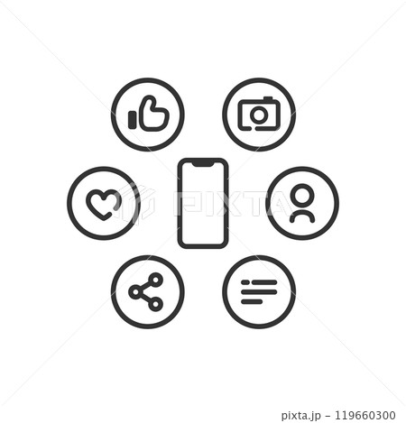 スマホとSNSマーケティングのアイコン(線画・白黒)