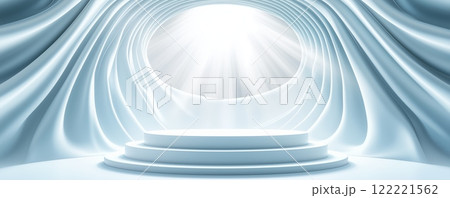 Bright illuminated space with soft drapery and a central stage platform
