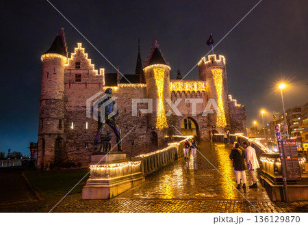 ベルギー アントワープのステーン城 夜のライトアップと冬のイルミネーション