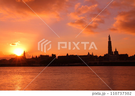 西ヨーロッパのベルギー アントワープを流れるエスコー川の対岸から朝焼けの市街地のシルエット