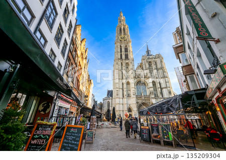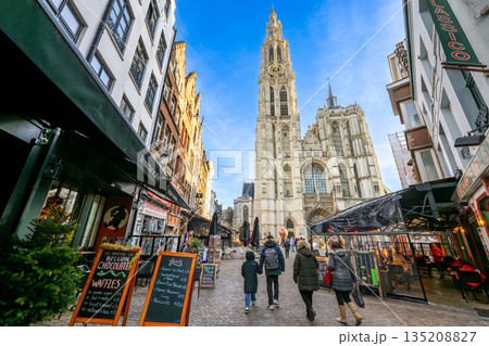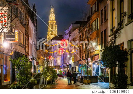 ベルギー アントワープの聖母大聖堂が聳える冬の街並み ライトアップされた夜の路地