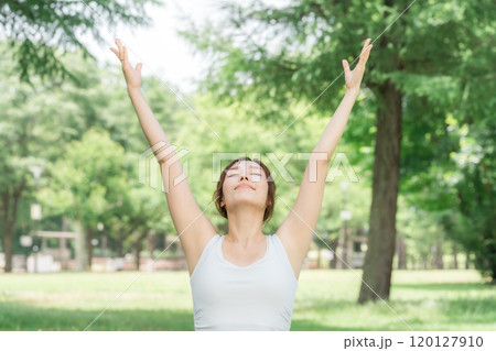 公園・森林でヨガ・ヨガ教室・ピラティスをするヨガ講師の女性