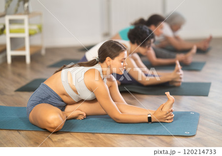 Portrait of woman making stretching legs with group sitting on sports mat and making yoga exercise at fitness club during Christmas holidays