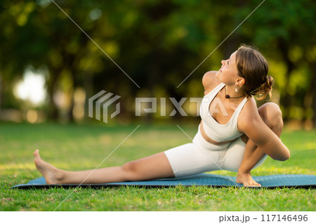 Girl performing twisting asana Matsyendrasana on green meadow
