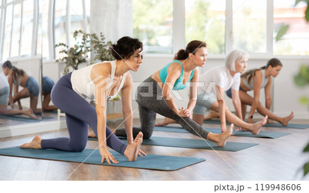 Group of women meditates in yoga pose parshvottanasana in gym. Demonstration of various yoga poses