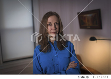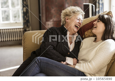 A young woman relaxing at home, with her feet up, having a cup of tea.