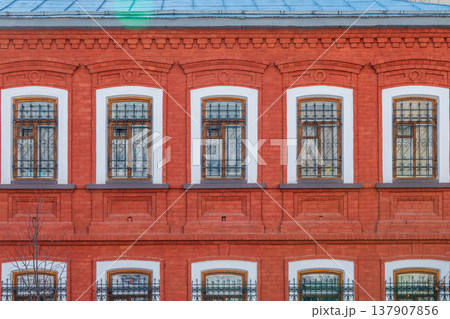 Brick wall of an old 19th century building with large windows. Wall of an old red brick building with five windows