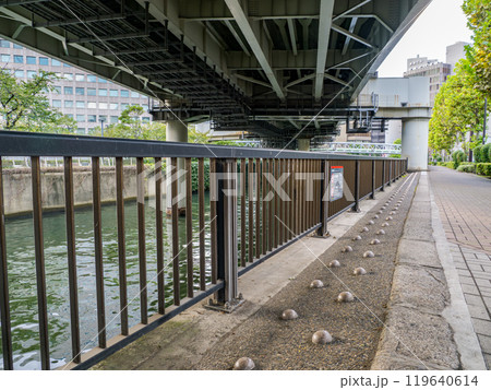都市の河川を支える高速道路の橋脚と静かな水面
