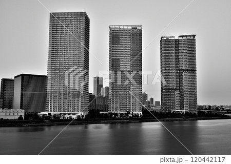 晴海大橋から観たららぽーと豊洲高層マンションの夕景 モノクロ