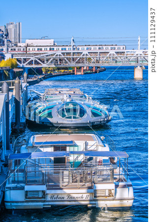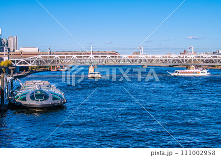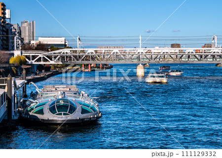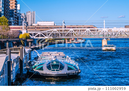 日本の東京都市景観 浅草水上バス乗船場のホタルナやアーバンランチ、ふぇにっくす、あじさい、特急=1月
