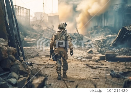 Faceless Soldier walking in destroyed city. Generative AI illustration