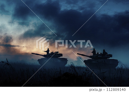 silhouettes of soldiers and battle tanks fighting in a war with smoke in the background. Ai generative