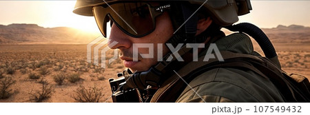 Close up face of Military special forces soldier crosses destroyed warzone through fire and smoke in the desert. Contemporary battlefield. Modern war. Special military operation. Generative AI