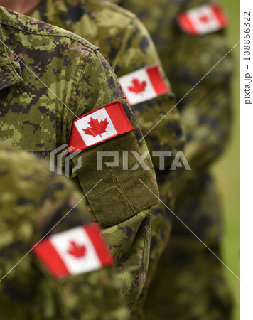Flag of Canada on military uniform. Canadian soldiers. Army of Canada. Remembrance Day. Canada Day.