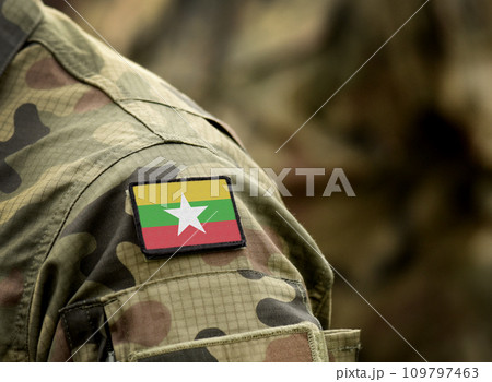 Flag of Myanmar and also known as Burma on military uniform. Army, armed forces, soldiers. Collage.
