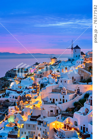 Sunset Oia on Famous Santorini island in Greece. Night illumination