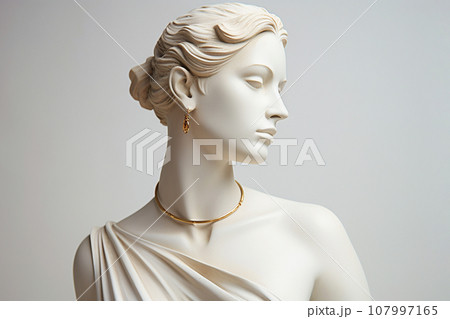 Statue with jewelry, bust of woman wearing golden necklace and earrings. Sculpture with luxury jewelry. Timeless, eternal beauty and style concept. Gypsum stone woman Greek statue with golden chain