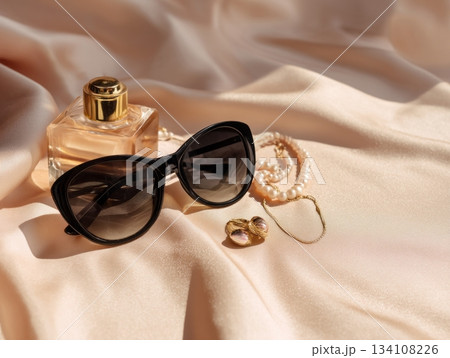 Sunglasses and perfume on beige background