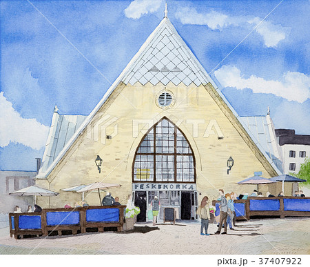 スウェーデン第二の都市ヨーテボリ 魚教会と呼ばれる魚市場の水彩画