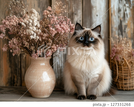 Balinese cat sits near wooden wall and vase with dried flowers, warm cozy rustic atmosphere.