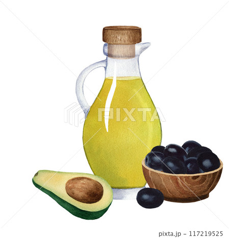 Composition of glass jug with olive oil, avocado, bowl with black olives and cork. Watercolor illustration on white background. For design, cards